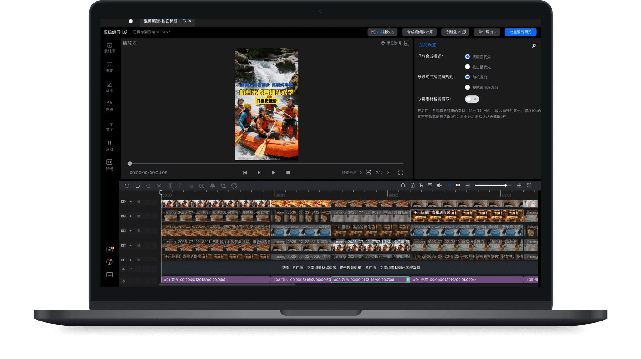 根据场景变化自动切片,帧级调整,一键拖拽使用片段